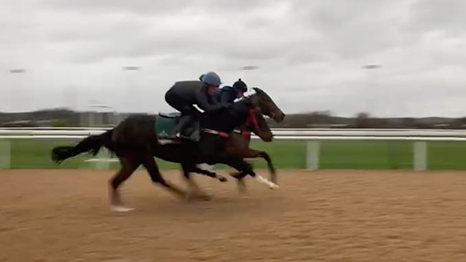 Last Saturday he did his most important piece of work since the treatment. He worked alongside one of his stablemates, Sycamore, a 7f/1m horse who is rated 70. As you can see from the video we filmed, he looked very comfortable in that gallop. Kat, who rides him regularly, said he hung left a little, which is probably a sign of the horse being cautious following his injury, but is nothing to worry about. Importantly, she told me there were no signs of him hanging his head as he did a month ago.